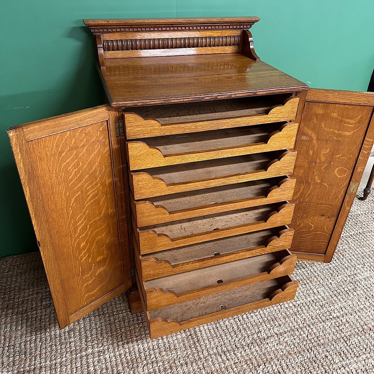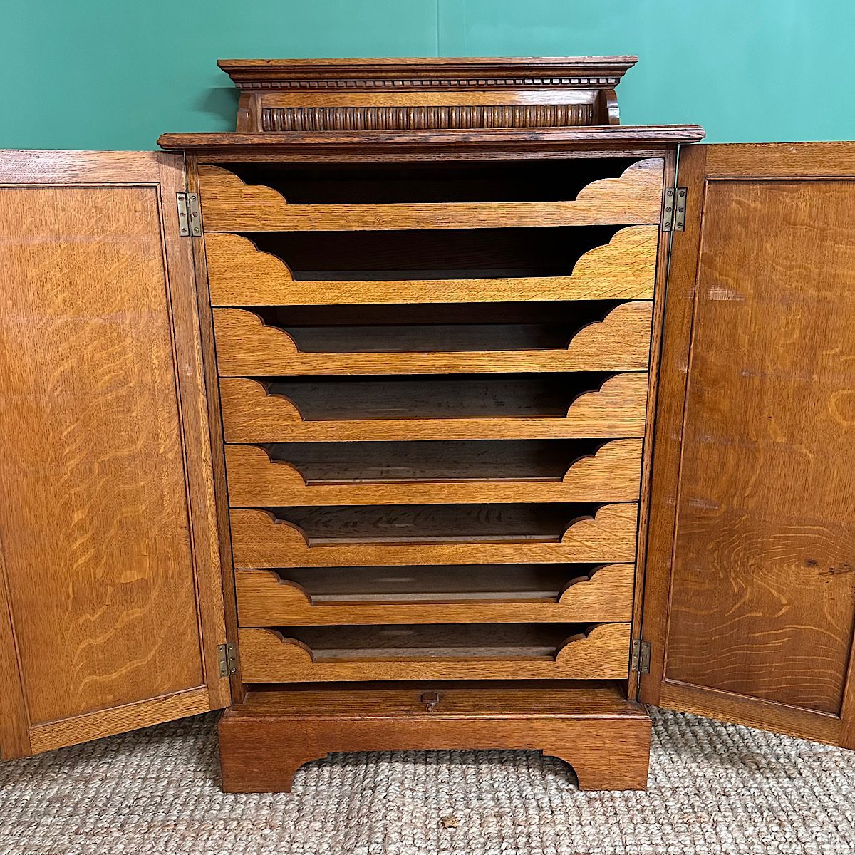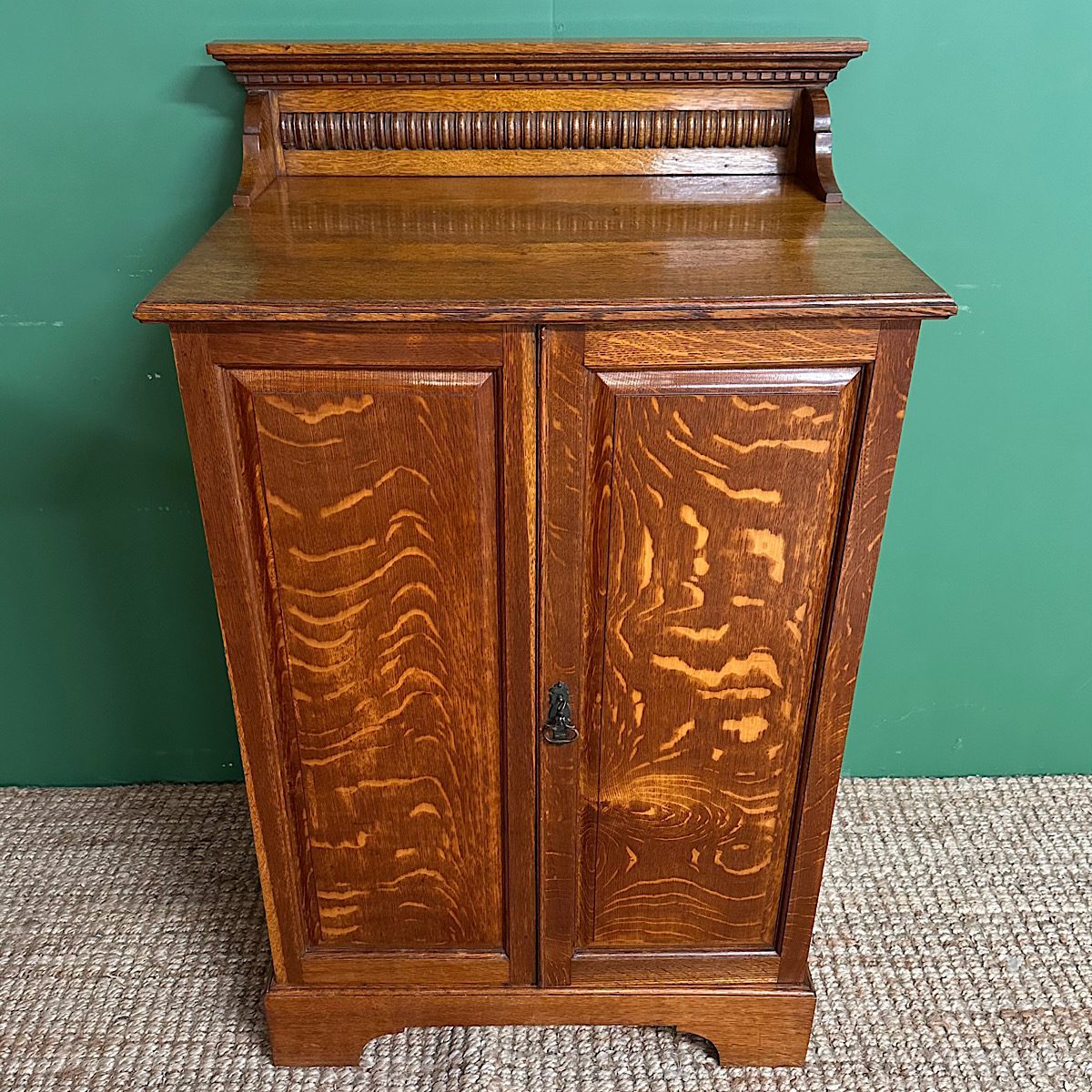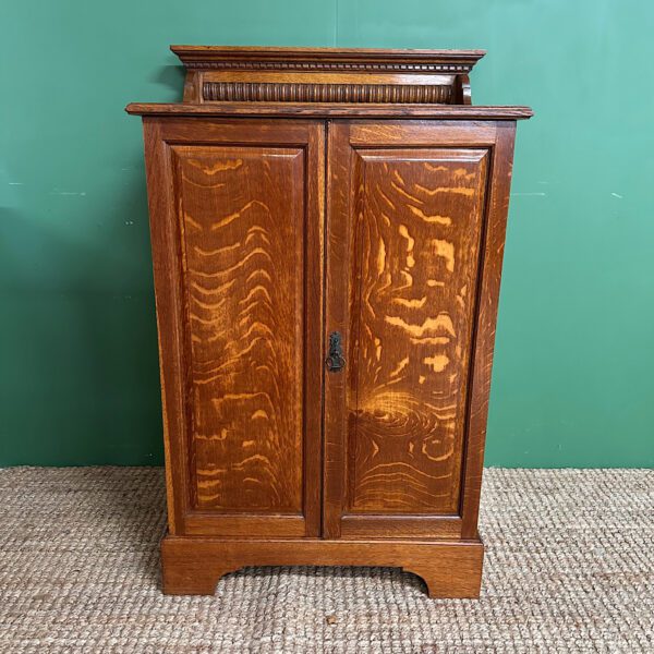 This Stunning 19th century Antique Victorian Cupboard / Cabinet is made from Oak and dates from circa, 1890. It has a small raised shaped back above a rectangular moulded top and two figured cupboard doors. They both have moulded edges and a key with working lock. The interior comprises of eight sliding shelves, ideal for clothing or paperwork. This quality Victorian cupboard stands on shaped bracket feet. The Oak is a warm shade with a striking grain, is in very good condition and has been beautifully cleaned using a traditional form of furniture wax finishing.
